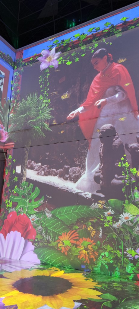 En la primera planta del Palacio de Neptuno nos encontramos con la exposición inmersiva, realizada con la técnica del videomapping. El vídeo narra los momentos más importantes de su vida —el accidente de autobús, su relación con Diego Rivera o la proyección de sus más célebres pinturas— y está compuesto por algunos de sus retratos más icónicos y por ilustraciones y por citas célebres de la pintora. Estas imágenes se proyectan en una gran pantalla central, en las paredes y en el suelo. A ello se le suma la música ambiental, la cual nos ayuda a introducirnos en cada una de las etapas de su vida.