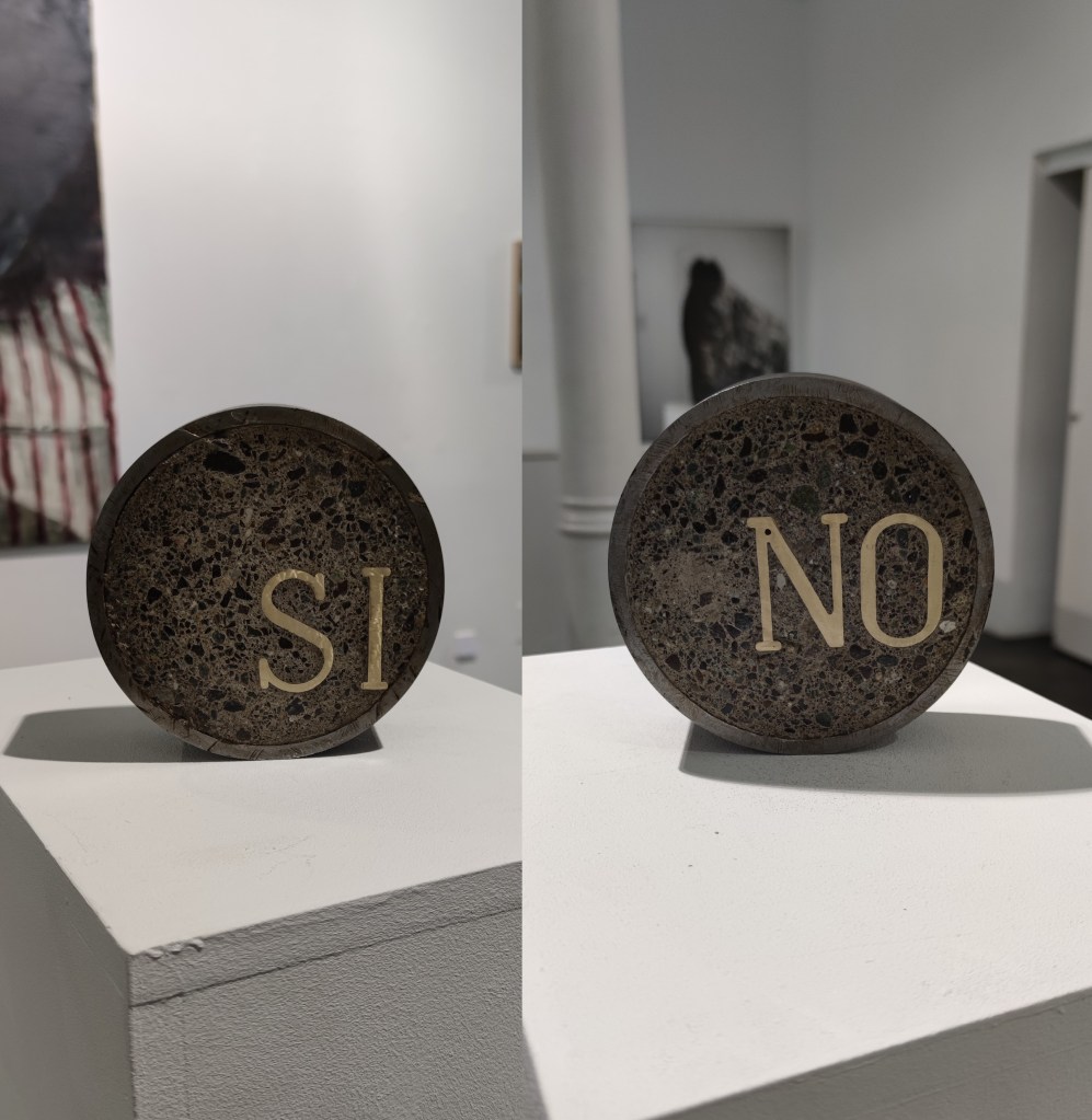 La primera pieza a la que debemos destacar por su importancia y significado es Sí/ No de la artista venezolana Jessica Briceño (Caracas, 1988). La comisaria decidió desde un inicio que esta pieza fuese a partir de la cual girase toda la exposición. se trata de la pieza central y está realizada en bronce, hierro y hormigón. Según como se coloque la pieza, cambia el significado de toda la exposición. Conceptualmente la artista se refiere con esta obra a la chispa primigenia, a la chispa transformadora, al inicio y al final. El fuego aquí está presente en el proceso de forja del del hierro, convirtiéndose éste en protagonista invisible de la obra.