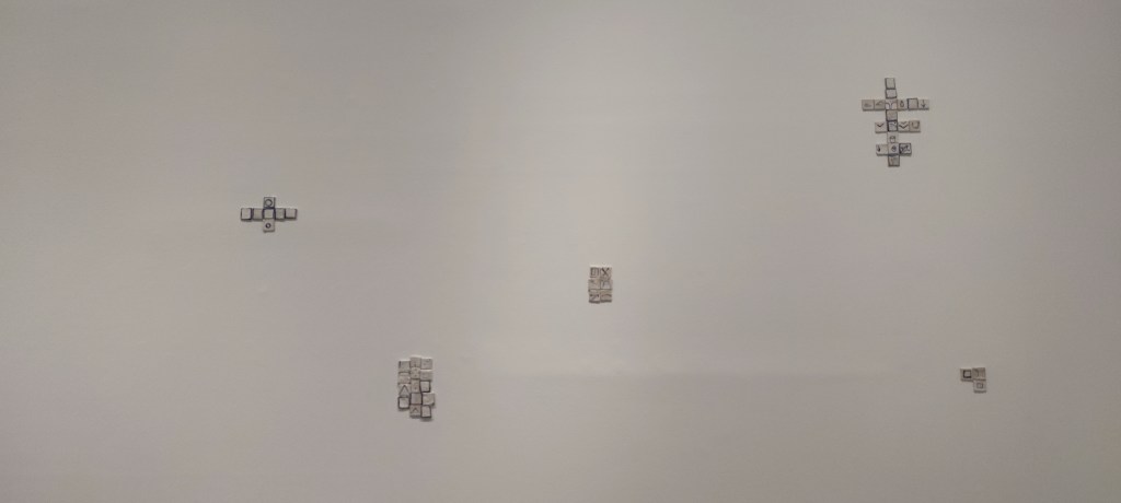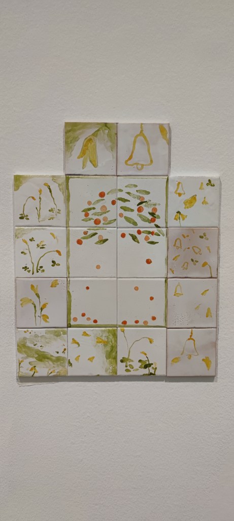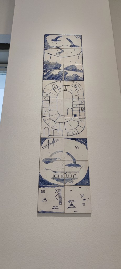 Los azulejos blancos pintados con dibujos están repartidos por toda la sala y se trata de una referencia a las marcas de peregrino. Árboles, notas, calendarios o mapas son algunos de los dibujos realizados en tonalidades azuladas y naranjas en el azulejo.