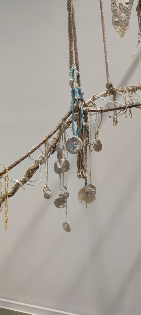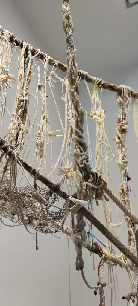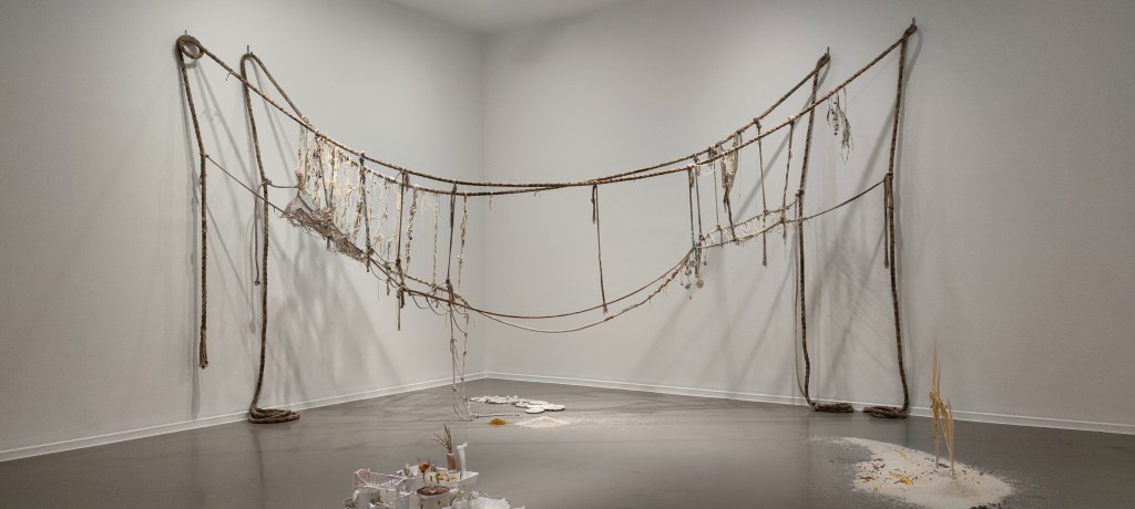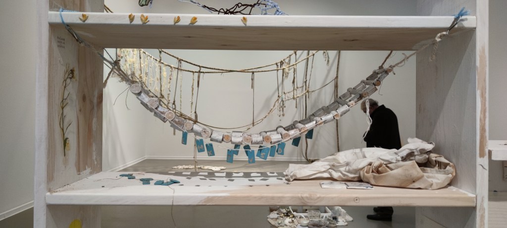 La obra central de la exposición es el puente, un puente entendido no como un destino, sino como un tránsito o un medio que conecta dos orillas. Este puente está realizado a partir de materiales perecederos como cuerdas, palmas o redes decoradas. Marina González se inspira en el puente de Q´eswachaka construido sobre el río Apurímac cerca de Cuzco, Perú. Durante el mes de junio cuatro comunidades nativas de las cercanías se reúnen desde hace varios siglos con el propósito de reconstruir el puente que durante los meses de primavera se deteriora a causa de las fuertes lluvias. Este puente que conecta las dos orillas del río Apurímac y las comunidades de Chaupibanda, Choccayhua, Huinchiri y Ccollana Quehue es entendido por la artista como una metáfora del tránsito, del paso de una etapa de la vida a la siguiente.