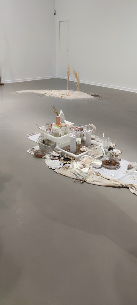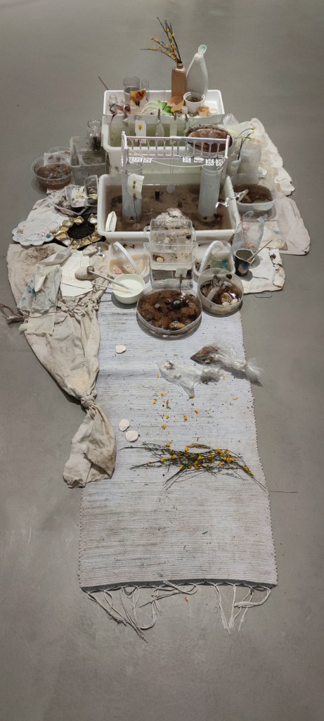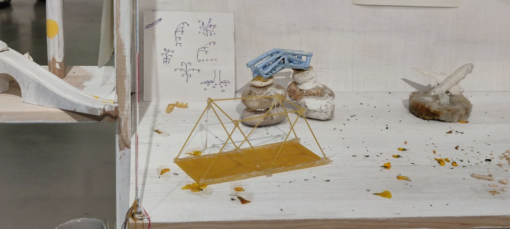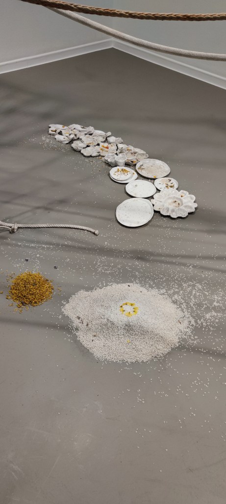 Si bien la obra de Ad Minoliti estaba centrada y dedicada a la infancia a través de la relectura desde la perspectiva queer del cuento de Caperucita Roja, la obra de Marina González Guerreiro se centra en la idea de cambio o transición propia del paso de la adolescencia a la madurez. La artista gallega en sus obras previas ahonda en temas como la rutina y la intimidad, pero para el proyecto de La Casa Encendida aborda un nuevo tema de estudio y trabajo: la idea de tránsito. El cambio de etapa y el concepto de puente o camino se puede interpretar como el cambio de la etapa adolescente a la adulta. Esta serie reúne diversas piezas formadas, como es habitual en la artista, por materiales precarios como cuerdas, azulejos, flores o palmas.